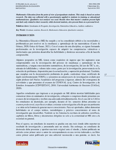 Palabras clave: Estudiantes de Posgrado, Investigación, Matemática Educativa, Análisis cualitativo.