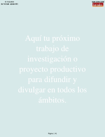 © FEGLININ ISSN 2594-2298 | Año 7, No 26, julio – septiembre 2023 | Aquí tu próximo trabajo de investigación o proyecto productivo para difundir y divulgar en todos los ámbitos. Página | 41