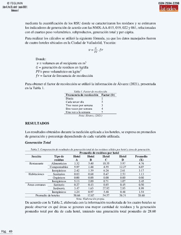 Tabla 2. Comparación de resultados de generación total de los residuos sólidos por hotel y área de generación.