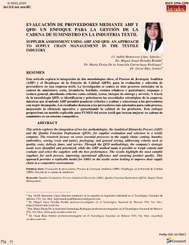 Palabras clave: Evaluación de proveedores, Proceso de Jerarquía Analitica (AHP), Despliegue de la Función de Calidad