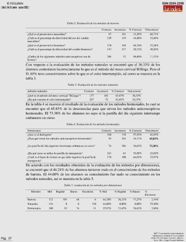 En la tabla 4 se muestra el resultado de la evaluación de los métodos hormonales, lo cual se