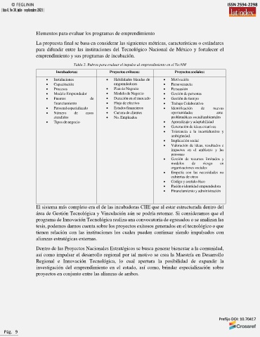 Tabla 2. Rubros para evaluar el impulso al emprendimiento en el TecNM